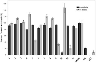 At least in vitro the Linoleic acid (10), N-benzoyl-L-phenylalanine methyl ester (9) and (-)-dehydrololiolide (12) components of the shrub extract were found to be active in the enzyme-based AI assay (10) and the cell-based AI essay (9,12), respectively. While the increase in cell based aromatization (+50%) by Linoleic Acid will negate some of the effects of the other two compounds, the overall impact on cell based aromatization would still be roughly -40% (additive effects assumed, cf. note 1). The one on non-cellular aromatase induced by Linoleic acid (10), on the other hand, would be about -90%, as both, N-benzoyl-L-phenylalanine methyl ester (9) and (-)-dehydrololiolide (12), had only negligible influence on the enzyme based AI essay.
