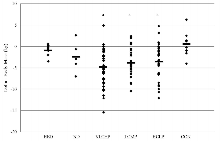 | Figure 1: Changes in weight for High Energy Diet (HED), No Diet (ND), Very Low Carbohydrate High Protein Diet (VLCHP), Low Carbohydrate Moderate Protein Diet (LCMP), High Carbohydrate Low Protein Diet and no diet + no exercise Control (CON) |