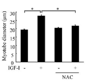 While treatment with H2O2 significantly enhanced IGF-I-induced phosphorylation of the IGF-I receptor (IGF-IR), IGF-IR phosphorylation was markedly attenuated when cells were treated with antioxidants. The downstream signaling pathway, Akt-mTOR-p70S6K was subsequently down-regulated. Furthermore, thephosphorylationof FoxO1by IGF-I decreased concomitantly with the restoration of the expression of its target genes, Atrogin-1 and muscle RING finger 1, which are related to muscle atrophy.