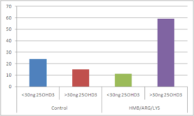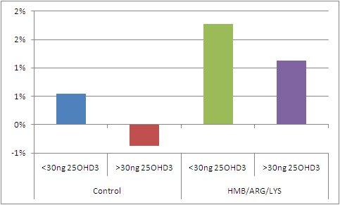 The results of their study (cf. figures 1-2) suggest that 'adequate' vitamin D levels (25OH-D3 > 30ng) are not required for the HMG + Arginine + Lysine amino acid mixture to work its muscle building magic on elderly subjects.