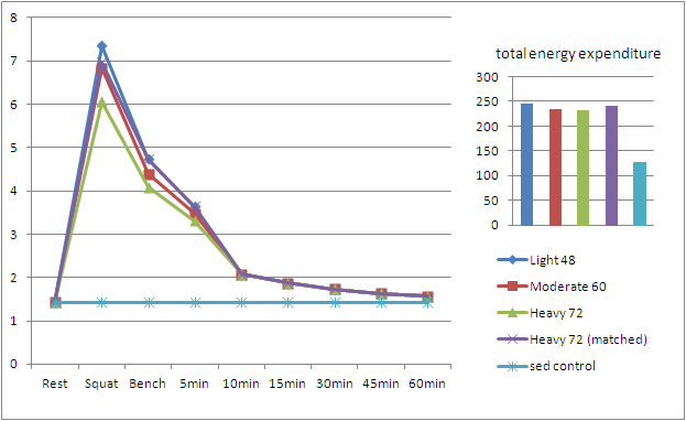 As figure 2 goes to show, there are differences in energy expenditure between the different protocols, during the squat, the deadlift and up to 5 minutes post exercise, nevertheless, the "