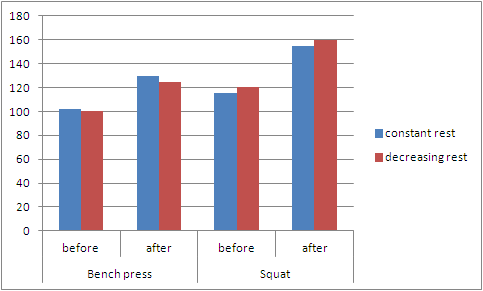 | Figure 3: 1RM performance (in kg) for bench press and barbell squat before and after the 8-week training period in subjects with constant and decreasing rest periods (data adapted from Souza-Junior. 2011). |