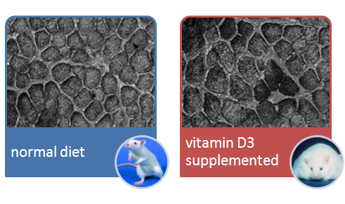 As you can see in figure 1 both groups (2x N=10) of 6 weeks-old male C57BL/6 mice were fed identical chows (AIN93G; cf. figure 1, large), varying only in their vitamin D3 content (1IU in the control group, 10IU in the supplemented group). In human terms this would be
