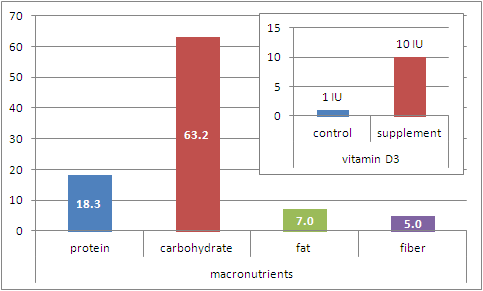 | Figure 1: Composition of the diet (large figure) and respective vitamin D3 content (small figure) of the diets of the control and the supplement group in the study. |