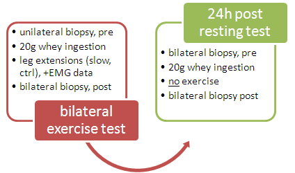 Participants subsequently performed bouts of unilateral leg extension exercise at 30% ofThe participants performed a total of 3 sets with 2 minutes of rest between the sets for each condition. Lifting cadence was monitored by an instructor and by the use of a metronome. Moreover, the exact knee-joint angles were recorded by the means of a goniometer. After a subsequent 2nd blood sample was taken, all participants consumed 20g of whey protein isolate. 6h after, a 2nd bilateral biopsy was taken and the participants were fed a standard cafeteria meal. For the rest of the day they were advised to follow a diet that would mirror their previously recorded food intake, with the last meal being consumed before 22h, "to ensure a 10 h fast prior to the beginning of the 24 h post-exercise protein synthesis measurement", which took place the next morning after the consumption of another 20g of a tracer-enriched whey protein supplement.