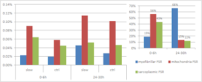 | Figure 2: Fractional protein synthesis (in % per hour) - left; and relative differences in protein synthesis of slow vs. ctrl condition - right (based on Burd. 2011) |