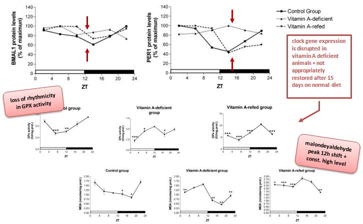 In the light of these recent results many previously observed, but not fully understood effects of vitamin A deficiency, such as the permanent memory impairments (Etchamendy. 2003) and its repeatedly suggested involvement as a signaling molecule (and as it now turns out potential zeitgeber) in physiological (synaptic plasticity, learning and memory, sleep), as well as pathological (schizophrenia, depression, Parkinson disease, and Alzheimer disease) neurological conditions (cf. Tafti. 2007).