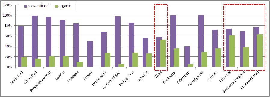 | Figure 1: Percentage of conventionally and organically produced products with detectable (those did not have to be above the allowed threshold levels!) pesticide residues (data based on MLR. 2012a) |