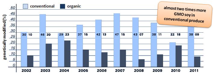 The data in figure 4 does yet also show that things look different for soy products, most of which are imported from countries where the production of GMO foods is actually allowed (like the US ;-) and even non-GMO crop can be exposed to cross-contamination. If we take a closer look and discard the annual variations, it does yet become obvious that the GMO content of organic products is just as their pesticide content still much lower than it is in conventional ones. What is pretty troublesome, though, is that in 2011 25% of the products that are advertised as "GMO free" contained small amounts (<0.1%) of genetically modified soy - for you, my American friends this means: Having a label alone does not protect you from "GMO fraud" ;-)