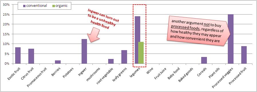 - legumes - another favorite of mainstream dietitians are not just among the worst offenders (24% of the conventionally produced legumes contain pesticides above the tolerable limit), they are also the only product where even the organic variety is not suitable for human consumption in 11% of the cases and as if that was not enough, the number of substances above that threshold amounts to 17 compounds in the conventional and 3 substances in the organically produced legumes