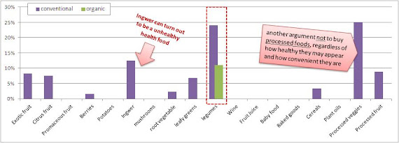 - ginger (=ingwer)- the conventional variety something many people use to improve their health had higher than tolerable levels in 12.5% of the cases; a health food "gone unhealthy", if you will