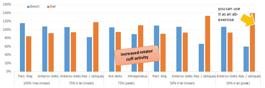 What's somewhat surprising, yet maybe highly relevant and an important argument that would speak against doing your chest presses on a stability ball, though, is the highly significant activation of the infraspinatus, the "small" muscle, most people tend to forget about until they suffer from their first rotator cuff injury.