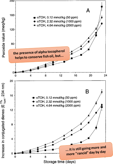Figure 2: Fish oil does go rancid over time, vitamin E just turns an exponential into a linear process (Kulas. 2001)