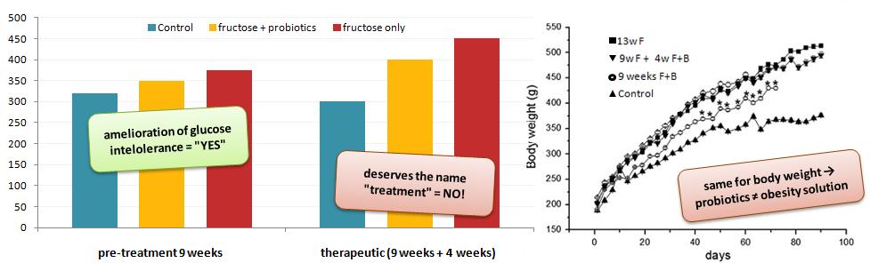 The improved response to the glucose tolerance test, on the other hand was observed in both the pre-treated group, in which the rodents received fructose and probiotic bacteria together for 9 weeks, and the "therapeutic" group, in which the probiotics were gavaged to already obese rodents for only four weeks.