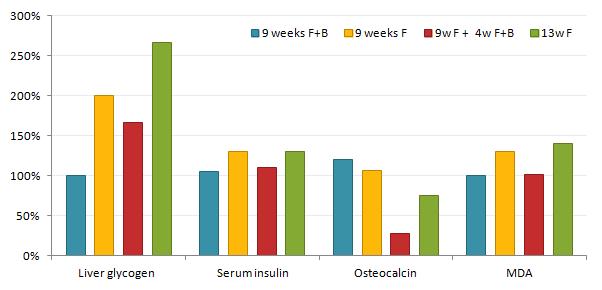 | Figure 1: Liver gylcogen, serum insulin, osteocalcin, and MDA levels expressed relative to rodents on control diet after 9 and 13 weeks on different diet + supplementation regimen (Zhang. 2013) |