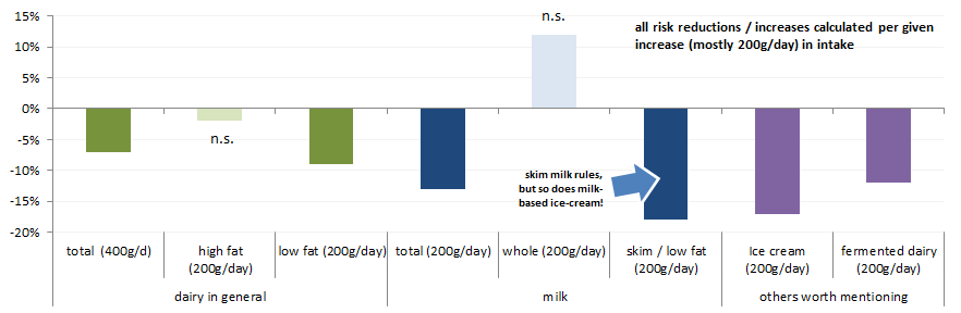 I would also like to emphasize that both explanations I presented to explain the absence of beneficial effects of full-fat dairy and the non-significant detrimental effects of full-fat milk, yesterday, are just as the word implies "hypothetical" and I am not claiming to be sure that any of them fully explains the high vs. low fat difference. To be honest, I would be flabbergast if only one of them was the - meaning the only - reason that full-fat milk consumption does not yield the same reductions in diabetes risk as skim or low fat milk (and dairy in general).