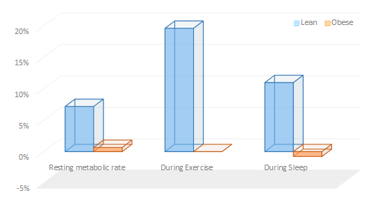 | Figure 2: Relative increase in resting metabolic rate, energy expenditure during exercise and sleep in lean and obese women in response to the ingestion of 4mg/kg of caffeine (vs. placebo | Bracco. 2014) |