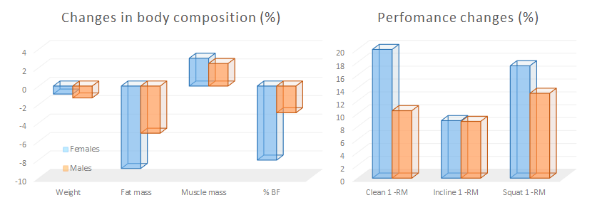 "Both males and females significantly improved upper and lower body strength following the 6-week PCT program: 1) clean [males: +10.47% or +12.53 kg (from 119.70 ± 11.73 to 132.22 ± 10.88 kg, p = 0.001) and females: +19.98% or +8.94 kg (from 44.74 ± 7.34 to 53.67 ± 7.35 kg, p = 0.001)], 2) incline press [males: +8.81% or +9.85 kg (from 111.87 ± 14.36 to 121.72 ± 15.50 kg, p = 0.021) and females: +8.93% or +2.84 kg (from 31.82 ± 4.33 to 34.66 ± 5.75 kg, p = 0.002)], and 3) squat [males: +13.17% or +19.95 kg (from 151.51 ± 16.31 to 171.46 ± 21.92 kg, p = 0.002) and females: +17.44% or +11.1 kg (from 63.64 ± 7.63 to 74.74 ± 10.26 kg, p = 0.001)]. A post-training percent change in clean for females was significantly greater (19.98 vs. 10.47%, p = 0.009) than males, whereas the other post-training percent changes in incline press and squat were not significantly different between males and females." (Miller. 2014)Impressed? Well, this is not the first study to show that women respond particularly well to any type resistance training.
