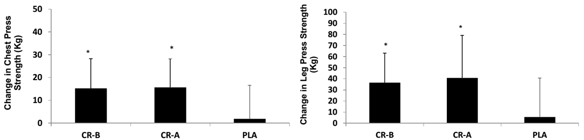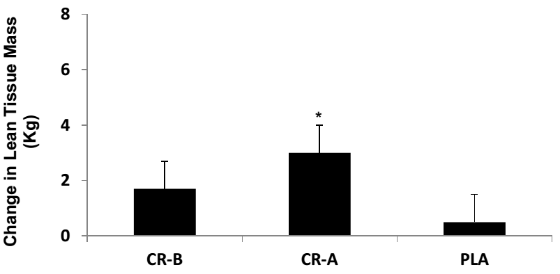 | Figure 2: The inter-group difference between the strength gains is less pronounced than the one between the mass gains in the creatine before (CR-B) and creatine after (CR-A) groups in this study. |