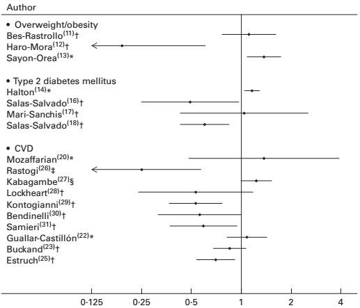 | Figure 3: Odds and hazar ratios and 95 % CI for the fully adjusted model in the studies included in Sayon-Orea's 2015 systematic review. * Fried food consumption as exposure. † Olive oil