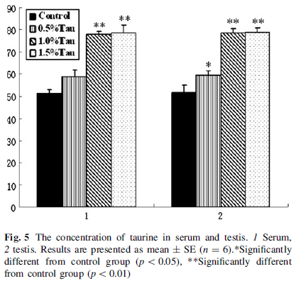 It is however relatively unlikely that levels >400lg/ml and thus negative effects will be achieved by orally administered doses of taurine. This hypothesis is validated by the results of the study (cf. Jang. 2010 Figure 5; below) which clearly illustrate that levels >1.5% taurine in drinking water did not significantly increase taurine levels in the rat testes above the levels achieved with 1.0%.