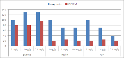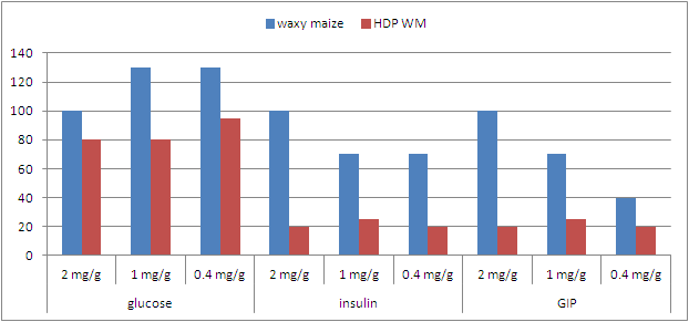 | Figure 5: Area under the curve for glucose, insulin and GIP in mice after administration of 2mg/g highly gelatinized regular or HdP waxy maize starch to mice in the presence of 0.4, 1 or 2mg/g of the saturated fatty acid triolein (data adapted from supplementary material to Shimotoyodome. 2011) |