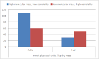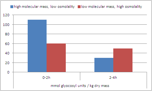 | Muscle glycogen resynthesis 0-2h and 2-4h after ingestion of 4x75g of carbs from either high molecular weight or low molecular weight starch sources at 0, 30, 60 and 90min after a standardized 120min exercise protocol (data adapted from Piehl. 2000) |