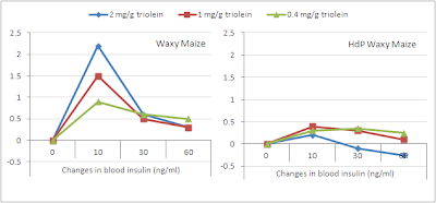 | Figure 4: Time-course of the changes in blood glucose (left) and insulin (right) after ingestion of waxy maize or HdP waxy maize pancakes (data adapted from Shimotoyodome. 2011) |
