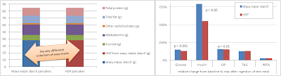 figure 4 the ameliorative effect of the replacement of regular waxy maize (which, as you will remember already is a "slow(er)" carbohydrate source) with its HdP cousin, is particularly pronounced and statistically significant in the early part of the post-prandial window.