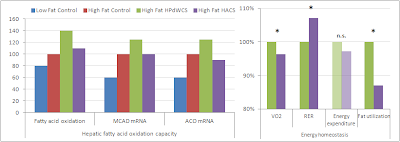And while the increase in energy expenditure in the HdP waxy maize group did not reach statistical significance (p = 0.064), the upregulation of the fatty acid oxidation capacity, medium-chain acyl-CoA (MCAD) dehydrogenase and acyl-CoA oxidase (ACO) activity in the liver of the mice, as well as the subsequent absolute and relative increase in 78h fat utilization (+13%, cf. figure 2, right) would probably be very welcome "side-effects" for any of the afore-mentioned potential customers.
