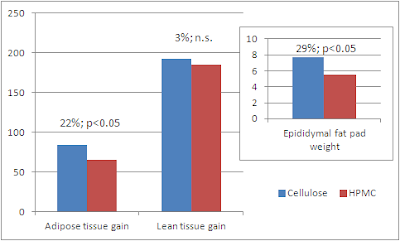 While its artificial origin will obviously make the ANTI faction cry out loud, again, I suggest you first read about the effect HPMC had on the animals, before you totally discard it as being "not natural", "non paleo", "the work of Monsatan" or whatever...(btw. it is at least kosher ;-)| Figure 1: Changes in body composition (weights in g) after 6 weeks on standard diet with either non-viscous cellulose or viscous hydroxypropyl-methylcellulose as the primary source (5%) of dietary fiber (data adapted from Islam. 2011). |