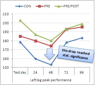 - the decrease in right leg peak force was about 16% in the CON group compared to 9% and 7% in the PRE and PRE/POST groups, respectively
