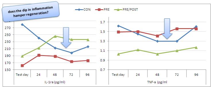 Take a close look and don't be fooled like I was, when I initially looked at the results and almost automatically assumed that there was a reduction in TNF-alpha and IL-1 in the group that recevived the most HMB (I must say I had only the poor black and white graphs from the original study and not the full-service pack you get, here at the