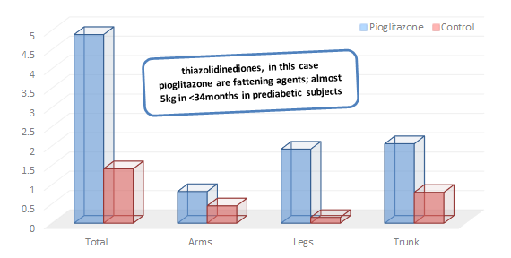As paradox as it may seem, the anti-diabetic effects of PPAR-gamma activating thiazolidinediones (TZDs) which are still used to "treat" (I should rather write "manage") diabetes mellitus and other diseases that feature insulin resistance will thus come at the expense of increased body fat storage. The latter can be pretty pronounced,as the data from pre-diabetic individuals Bray et al. published only recently goes to show you (figure 1). Despite their anti-inflammatory effects and their (limited) use in highly inflamed type II diabetics you will therefore not find any of the herbal PPAR-gamma agonists like pomegranate, pumpkin, mellisa officinalis, morus alba, artemisia capillaris, bitter melon, guggul, banaba or mulberry (cf. Huang. 2009) in the stacks below. And that despite the fact that they have anti-inflammatory activities.