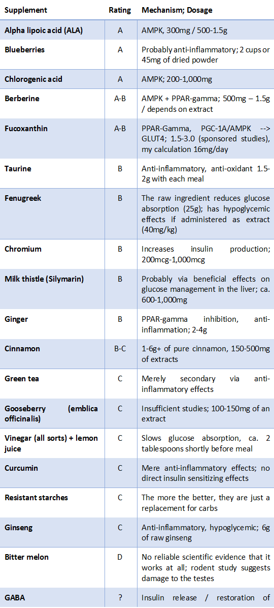 Table 1: List of the most important supplements discussed in the series; more details on each of them, as well as on those I did not include in this overview can be found in the individual installments. - Metformin - 3x 300-500mg (not lipoic acid, this is why)
