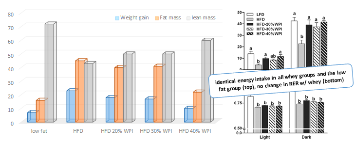 If you take a look at the data in Figure 1, it's easy to see that (a) in comparison to casein (data from casein experiment not shown, because it was not discussed in detail | maybe there will be a follow up paper!?), WPI at a similar energy content normalised energy intake, increased lean mass and caused a trend towards a reduction in fat mass (P= 0.08). You may find that surprising, but it's actually been known for quite some time now that whey buffers many of the ill-health effects of high fat diets in rodents.