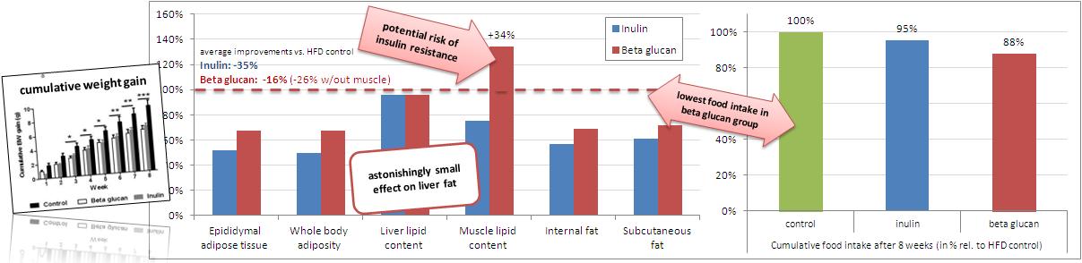 If we take a closer look a the differential effects of inulin and beta glucan, there yet only one figure that really sticks out and that's the accumulation of fat within the musculature of the animals. The "beautiful marbling" people are looking for in their steaks, however, usually is a harbinger of impeding or even existing skeletal muscle insulin resistance. A muscle fat content above the high fat control (it's certainly a weakness that we don't have a "real" control group on standard rodent chow, here) as Arora et al. observed it in the tissue samples of the beta glucan group, does thus tell you something about its potential usefulness, or rather uselessness of this specific type of fermentable fiber.