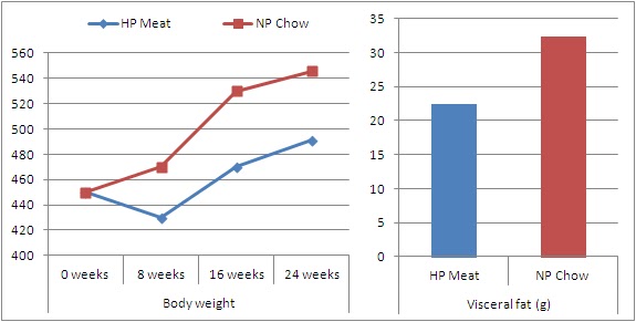 Figure 1: Body weight (in g) during and visceral fat (in g) after 24 weeks on high protein meat or normal protein chow diets (data adapted from Chen. 2012)