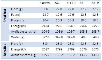 Obviously the test breakfast, as well as the bars and beverages the dietary composition of which you can see in table 1 contained additional "functional" additives. As indicated by the titles above the respective columns in