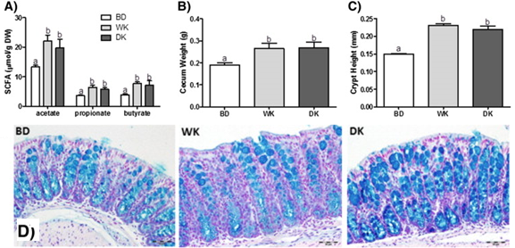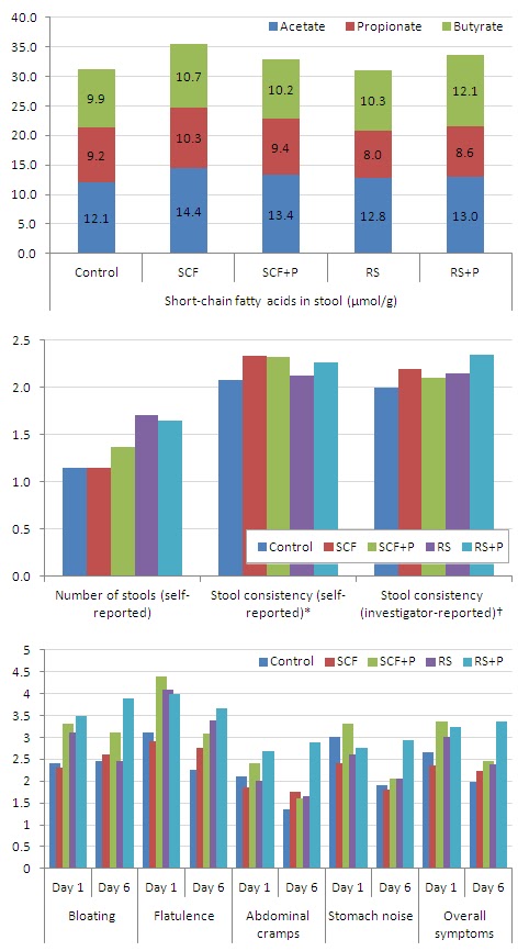 "[a]mong the treatments, the control was significantly different from the SCF (P<0.001) and SCFþP(P<0.0002) treatments. The SCF treatment was significantly different from the RS treatment (P<0.007), and the SCF+P treatment was significantly different from the RS+P treatment (P<0.002). The GMC [gut microbial community] following the consumption of the SCF and SCF+P treatments was not significantly different." (Klosterbuer. 2013)
