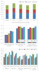 | Figure 1: Short-chain fatty acid content of the stools (top), number of stools and consistency (1=hard, 4=diarrhea, middle), gastrointestinal symptoms (bottom, Klosterbuer. 2013) |
