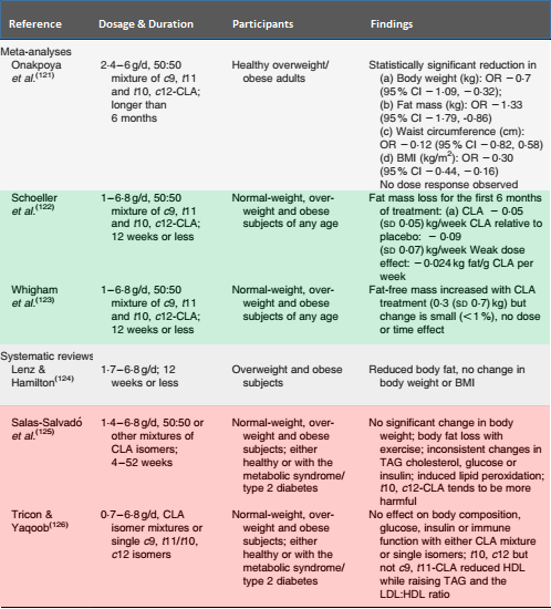 - Onakpoya IJ, Posadzki PP, Watson LK, Davies LA, Ernst E. The efficacy of long-term conjugated linoleic acid (CLA) supplementation on body composition in overweight and obese individuals: a systematic review and meta-analysis of randomized clinical trials. Eur J Nutr. 2012 Mar;51(2):127-34.
