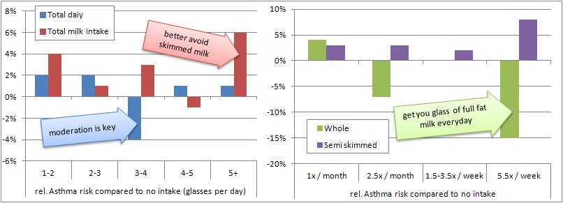 What's even more intriguing, though, is that the consumption of equal amounts of full fat milk was associated with a statistically significant 25%(!) reduction in asthma-risk (and recurrent wheeze symptoms) in the ~60,000 children / mother pairs from the dataset of the Danish National Birth Cohort the US scientists analyzed. Similarly, there was a