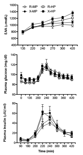 - the HP resulted in greater plasma essential amino acid responses (P < 0.01) vs. MP, with no differences in insulin and glucose responses - likewise without sign. differences in the exercise (X-MP and X-HP) vs .the resting (R-MP and R-HP, respectively, in Figure 1) condition.