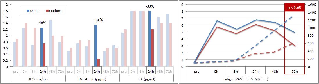 The levels of the pro-anabolic cytokine IL-12 (Argile. 2001), TNF-α, and IL-6 were significantly lower 24h after the workout (see figure 2, left; p < 0.05). There were yet no significant differences at other time-points ant both the CK-MB, as well as the fatique score (figure 2, right) suggest that the overall regenerative capacity was compromised by the repeated cooling of the strained musculature.