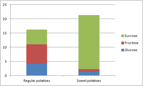 Figure 3: Mean free sugar composition (in mg/g) of fresh "regular" and sweet potatoes (comparison based on data from Zhu. 2011 and Dincer. 2011)