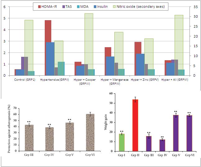 • Figure 5: Glucose metebalism markers of oxidation and nitric oxide (top) calculated artheorscleortic risk (bottom, left) and body weight gain (bottom right) in the different groups