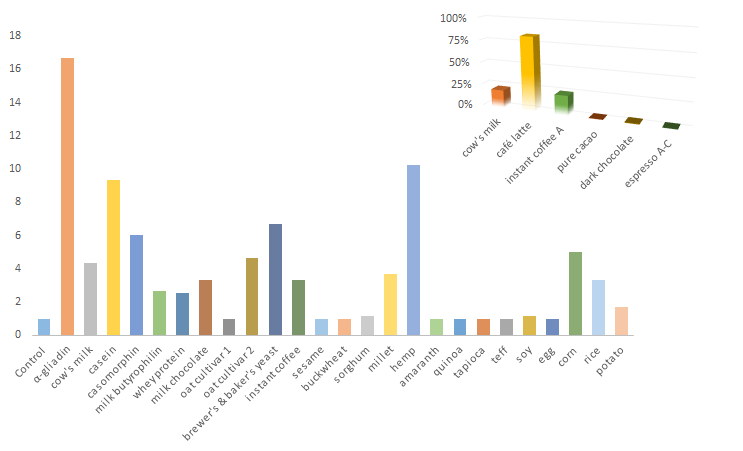 Figure 1: Reaction of affinity-purified α-gliadin 33-mer polyclonal antibodies to gliadin and different food antigens; data in large figure relative to control, data in small inset relative to a-gliadin (Vodjdan. 2013)