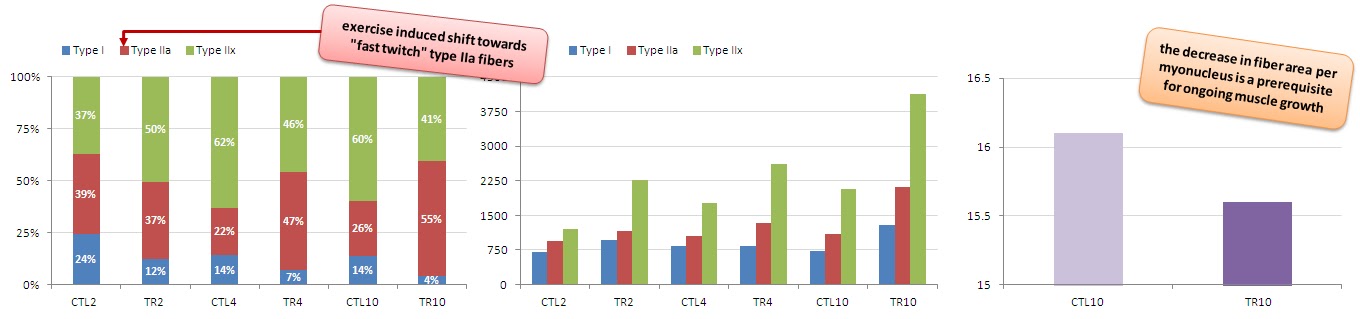 As you can see in figure 1 (right hand side), there was even a small, yet statistically non-significant decrease in the fiber area each myonucleus had to control and that despite quite impressive increases of 77%, 92% and 100% in the cross-section of the type-I, type-IIa and type-IIx fibers of the animals (figure 1, middle).