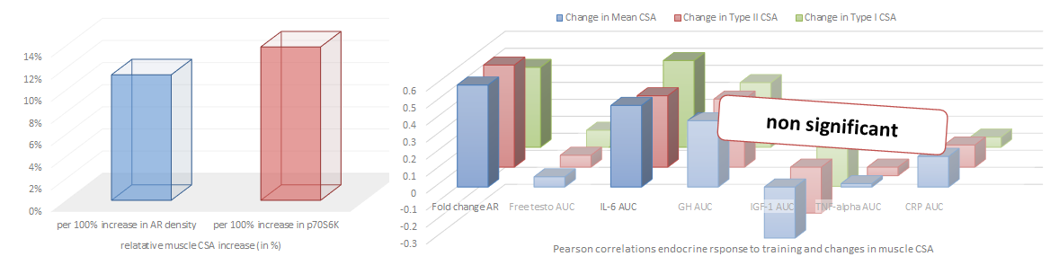 Figure 1: Relative increase in muscle CSA change for androgen receptor density and p70S6K expression (left) and individual correlation of endocrine changes and muscle CSA (right), data based on Mitchel. 2013)